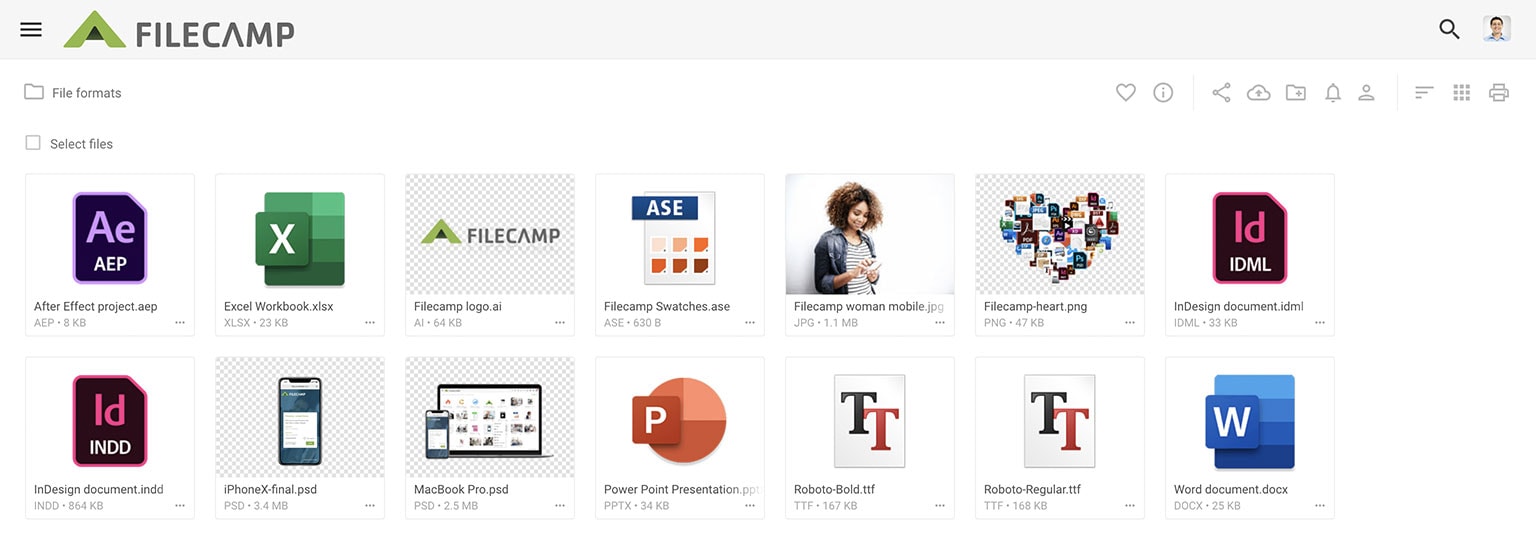 All file types can be uploaded and stored in your Filecamp, and you can preview almost any file format, including .pdf, .psd, .ai, .eps, .jpg, .tif, .mov, .avi, .mp4, .svg, .doc, docx, xls, xlsx, ppt, pptx, etc.